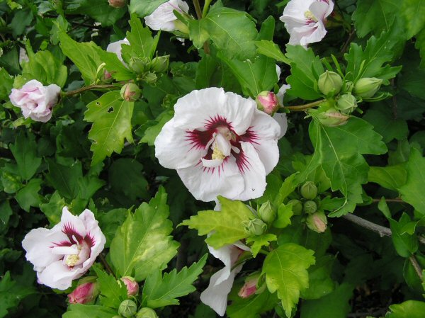 A hardy medium sized slow-growing shrub that is one of the last to come into leaf starting yellow during June but becoming dark green in time. The flowers begin in July or August and last for several weeks. 'Hamabo' is pale pink with blood-red feathered blotches in the centre.