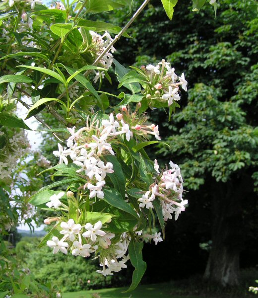 A deciduous hardy shrub, native to the N. W. Himalaya, growing to 3.5 m (11ft) by 3 m (9ft) at a slow rate with small dark green leaves and in June/July produces masses of highly fragrant pink tinged white flowers which are carried in clusters at the tips.