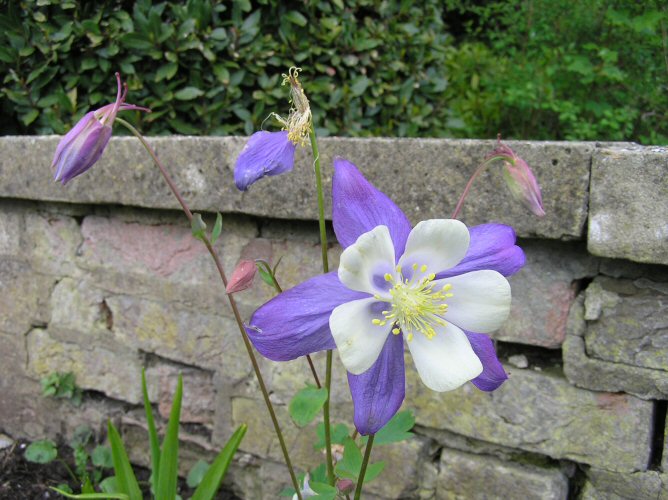 A small, charming, hardy, old-fashioned cottage garden plant with bonnet-shaped flowers, often two-tone and with long graceful spurs to about 80cm. Flowering in May and June, aquilegias fill the seasonal gap between the last of the spring bulbs and the first of the summer flowers. Self-sown aquilegias will naturalise amongst shrubs and roses interbreeding freely and seedlings will rarely resemble the parents. To keep chosen varieties pure, prevent self-seeding by deadheading shortly after flowering. display nodding spurred blooms, in a range of pretty colours that are carried delicately on tall wiry stems. They will quickly naturalise to form a crowd of spring blooms.