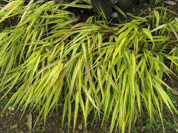 A small, clump-forming, but non-invasive, deciduous grass with narrow, arching, lance-shaped leaves striped green and yellow, flushed red in autumn and early winter with insignificant flowers in summer. Native to Japan.