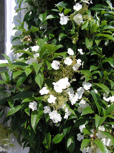 An unusual evergreen climber, native to Mexico, with large, glossy, leathery, serrated, dark green leaves and creamy-white, flat flower heads in summer which emerge from distinctive large round buds. Ideal for clothing a wall it is not as vigorous as the more familiar H. petiolaris, but if left unpruned, it will eventually reach a height and spread of 10 metres.