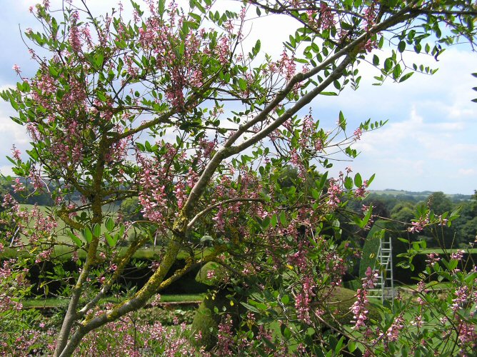 A medium-sized deciduous shrub, native to China, with pinnate leaves composed of 7-11 small, oval leaflets. Flowers light pink,pea-like flowers in summer 6mm in length, in dense erect racemes to 10cm in length