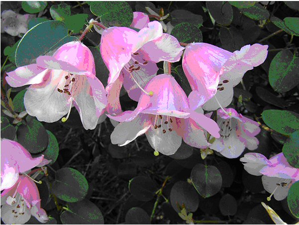 A wonderfully distinctive plant, forming a perfect mound up to 4 or 5 feet. Originally found only in China in central and western Sichuan. It is a plant of the mountains, growing at altitudes between 8,000-10,000' (2,400-3,000 m.) in isolated spots on cliff faces. There are usually only 2 or 3 flowers in a truss, bell-shaped nodding blooms in pink or rose, sometimes with spots. When the leaves are new, they are bronzy or chocolate-coloured, spectacular and unmistakable.
