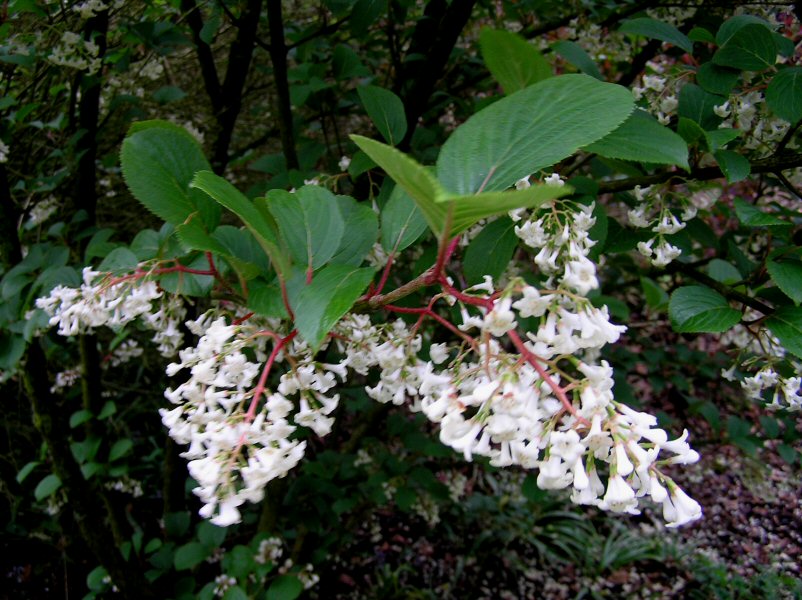 A loose, upright, graceful shrub growing 3m x 2m (10' by 8'). Leaves are glossy green, 50mm - 100mm (2-4") long and half as wide with a distinct reddish leaf stalks and central vein on the underside. Leaves emit a fetid odor when crushed. Flowers form in a loose, pendant, panicle about 50mm - 100mm (3-4") wide and 50mm (2") long. In June fragrant flowersappear that are pinkish in bud, opening to white with a pink tinge. Native to Sri Lanka, India, Himalayas, northern Burma, and China