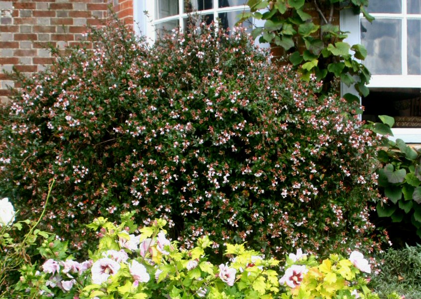 A deciduous spreading, hardy shrub, with glossy dark green leaves grown for its fragrant pink tinged white flowers freely borne in late summer. H: 1.8m S: 1.8m (6ft x 6ft). A cross between Abelia chinensis and A. uniflora.