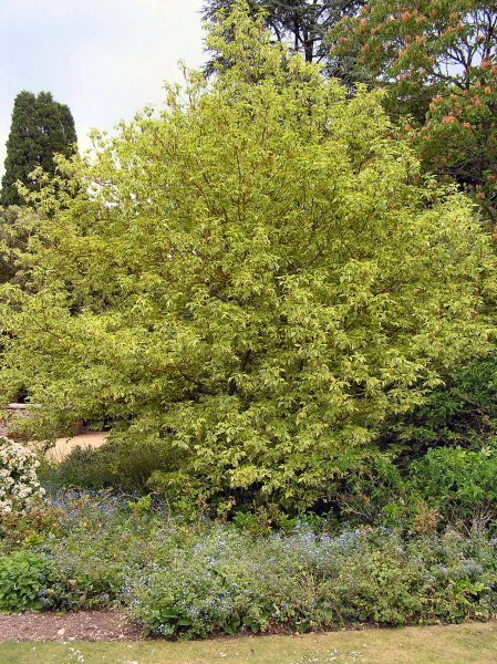A vigorous, upright to columnar, deciduous tree, up to 10m, bearing pinnate, light green leaves with pink margins that turn white in summer and clusters of yellow-green flowers in spring. The entire leaf turns yellow in autumn.