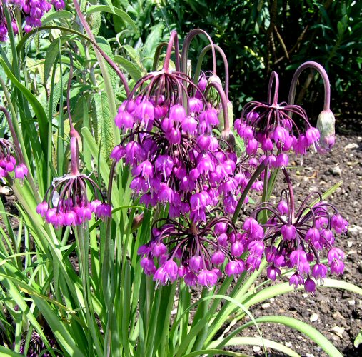 A hardy clump-forming ornamental onion, from North America, 30cm in height, that has very narrow leaves and produces loose umbels of nodding, long-stalked, pink bell-shaped flowers in early summer. It is a vigorous grower and spreads quickly. Similar to A.macanthum its Asian cousin but less than half the twice the size and its slender bulbs look more like rhizomes than bulbs.