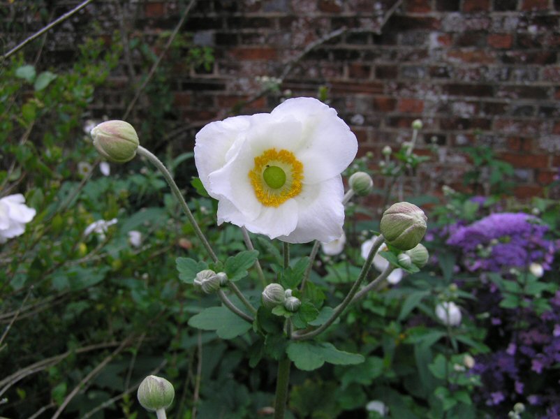 This Japanese anemone is a vigorous clump forming hardy perennial (120cm x 120cm) that flowers from August to October with pure white flowers and robust foliage of deeply-divided, slightly-bristled, dark-green leaves. that surround small, yellow disk flowers. The papery bracts last indefinitely when dried. Lance-shaped, white, woolly leaves turn green as they age, with white, woolly hairs underneath. Native to North America Site and Care: