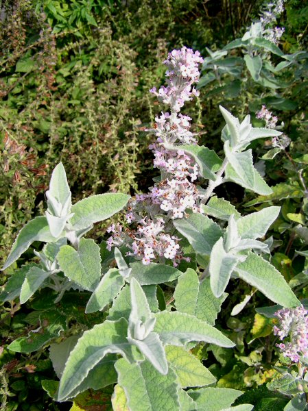 A hardy, deciduous, medium shrub up to 1.8m native to the Himalayas. Pendulous cluster of furry white buds open to tiny pink/lilac flowers, in late summer, over white downy leaves and stems.