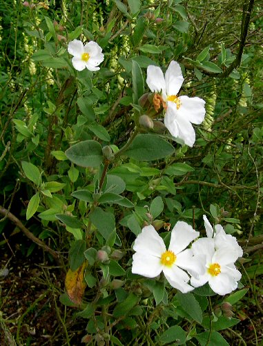 A medium sized evergreen shrub, to 1.5m, native to Southern Europe and North Africa with 5-petalled, bowl-shaped, white flowers with a central boss of golden yellow stamens,over a long period in late spring and summer. The narrow gray green leaves are lightly hairy.