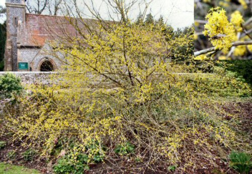 A deciduous spreading, open hardy shrub of the dogwood family with oval dark green leaves changing to reddish brown in autumn. H: 5m S: 5m (15ft x 15ft). Native to central and southern Europe and western Asia. Yellow flowers on bare shoots in late winter followed by bright red fruits.