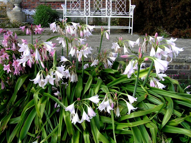 Bulbous perennials, sometimes evergreen, forming a tuft of strap-shaped, bright green leaves, with umbels of fragrant, trumpet-shaped light pink flowers to 12cm in width, on stems to 1.5m, during summer. 'Album' is the white flowered form