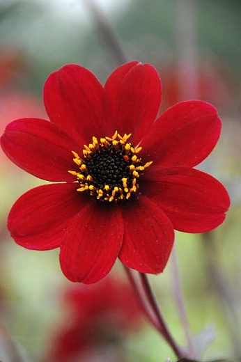 With lacy, deep purple to near black foliage set against masses of glowing red flowers, this is a particularly striking Dahlia with single flowers, up to 4 in. wide (10 cm) this variety is considered, by some,to be the best of the Bishop series.