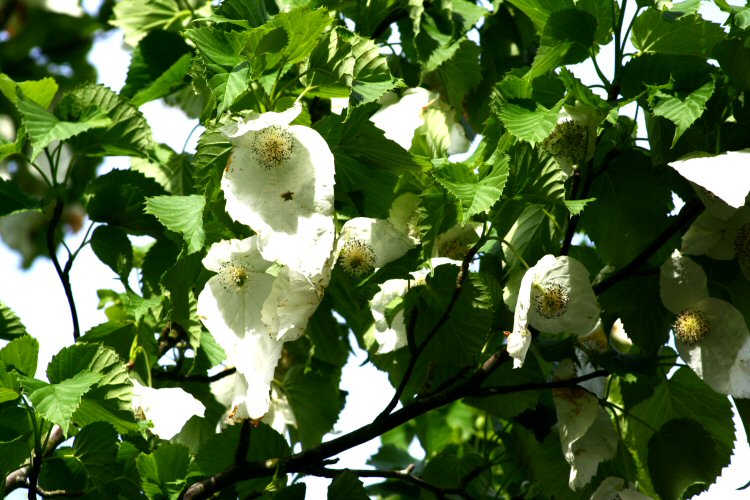 A hardy, moderately fast-growing tree to 20-25 m   the leaves are mostly 10-20 cm long and 7-15 cm wide and are ovate to heart-shaped. Best known for its flowers they form a tight cluster about 1-2 cm across, reddish in colour, each flower head with a pair of large (12-25 cm), pure white bracts at the base performing the function of petals. These hang in long rows beneath the level branches. The flowers are at their best in late May. On a breezy day, the bracts flutter in the wind like white doves or pinched handkerchiefs, hence the English names for this tree. The tree is native to Central and Southwest China and was introduced in 1904.