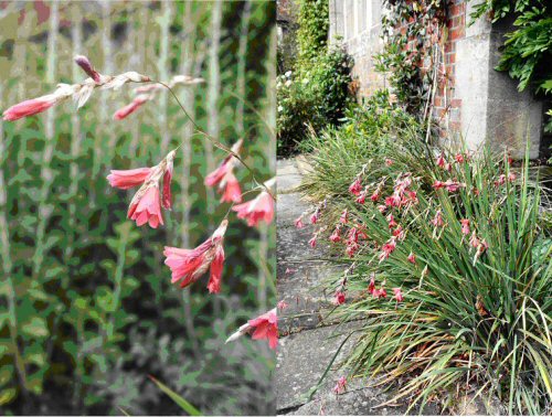 Sun loving draught tolerant architectural evergreen plant with gracefully arching, long, fine, hair-like stems. Dark pink wide-flaring flowers in summer. This spectacular little-known corm 3' high x 2' wide; hardy comes from South Africa. Quick to form clumps but can take up to 4 years to flower from seed.