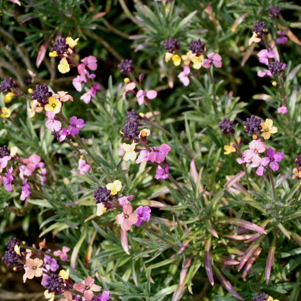 A shrubby perennial wallflower with narrow leaves, which hails   from the Canary Islands and Madeira. The original species had flowers which open pale yellow then age to mauve, blooming in spring.