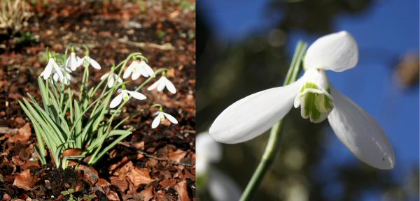 Introduced from Italy in the 1870s it is a vigorous hybrid of the snowdrop family with large narrow-petalled flowers in the characteristic hanging-claw. At 20cm (8") it is taller, with larger flowers, than the common snowdrop (G. nivalis), which can be seen a short distance away.