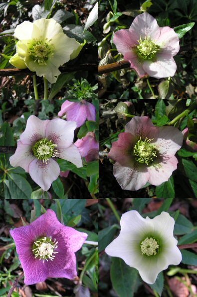 There are some 200 or more named varieties of this plant and most are in the range of white to magenta, with pinks and mauves, spotted or unspotted, being common. There are also greens, yellows, blues and many other possible variations not to mention virtually endless combinations of spotting and veining. The flowers have a range of shapes and sizes, with the possibility of doubles or semi-doubles, from round cup-shaped overlapping sepals to pointed star-shaped sepals. Often referred to as Helleborus orientalis it is now generally accepted that most are H. x hybridus as are nearly all stemless (acaulescent) varieties. We refer to ours as Hellebore 'Hinton Hybids' as most are self-seeded crosses.