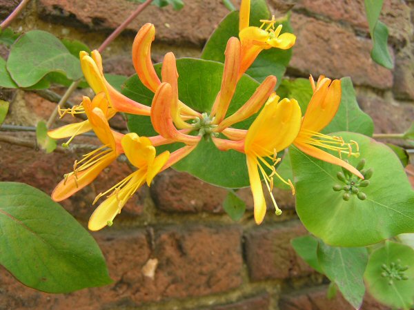 A deciduous climbing honeysuckle up to 5m (16 ft) with dark-green leaves and a blue-white colouring on the underside. It bears striking cartwheel-shaped bright copper-orange flowers in May & June.