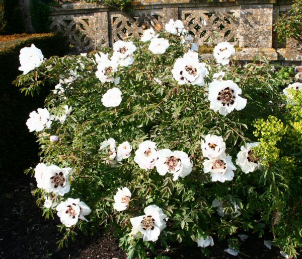 This is a beautiful, rare, tree peony from Western China. A very large, deciduous shrub 2.2m (7ft) by 2.2m (7ft) with slightly pendant branches. The leaves are dark green and blue-green beneath. The semi-double flowers are borne in late spring and are cup-shaped, white with deep maroon markings at the base of the petals and creamy-yellow stamens.
