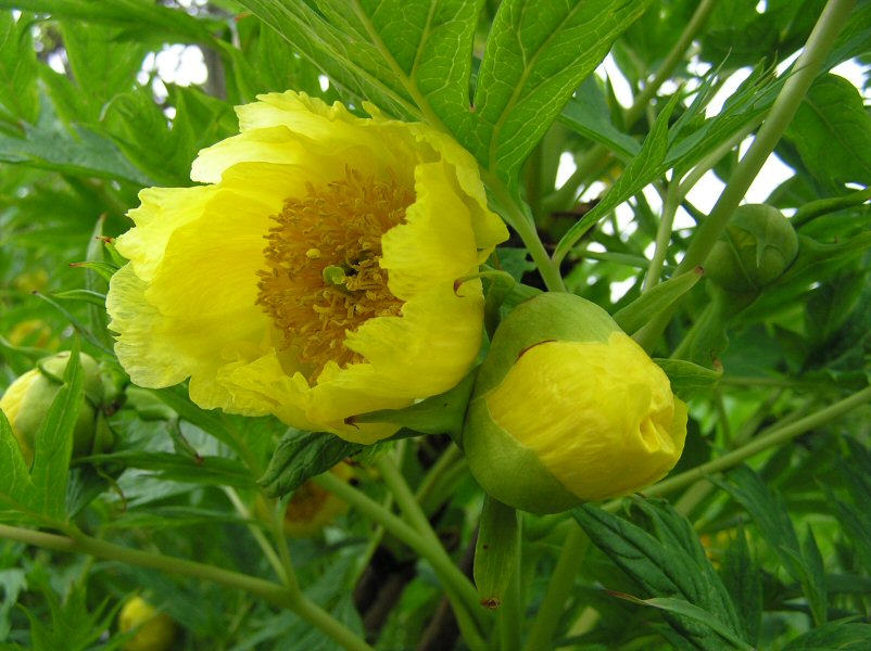 An open,   upright medium-sized (up to 2.5m) deciduous shrub with large, divided leaves.   Flowers bright golden-yellow, cupped, to 12cm in width, opening with the   leaves in May.