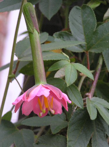 A vigorous perennial climber up to 6-7 m native to the Andean valleys with nearly cylindrical stems densely coated with yellow hairs. The deeply 3-lobed leaves, are finely toothed and downy above and grey or yellow beneath. The attractive blossom has a tube 7.5-10 cm long, grey-green, frequently blushed with red, and deep-pink petals flaring to a width of 5-7.5 cm.