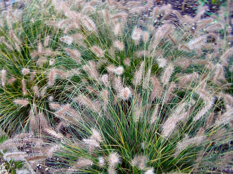 A hardy tall-growing grass native to Eastern Asia with a dramatic foliage variegation pattern of irregular transverse bands of creamy white and green arranged horizontally across the entire length of its leaves. The tall silky quills of soft-pinkish-purple flowers in late summer turn a golden russet and the flower plumes fade to a luminous silvery white in the autumn.