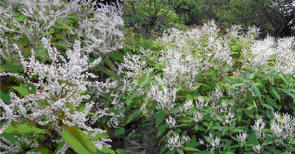 An ornamental plant growing to 1.5m x 1.5m (5' x 5') each season with 150-200cm (5-7') creamy white, profuse fleecy blooms from late July to late September. It has strong roots although it is not invasive, but it does require a large space. Of Asian origins it is probably a recent hybrid. Site and Care: