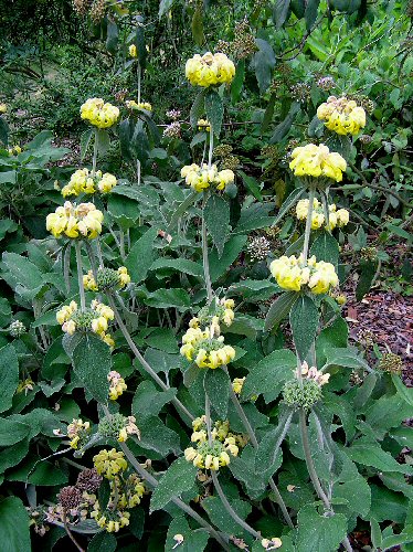 A hairy perennial to 90cm in height, with large, ovate, rough-textured grey-green leaves. Stout stems bear whorls of hooded, soft yellow flowers 3cm in length