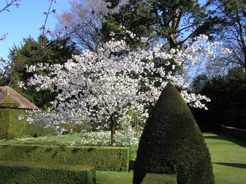 This is a very beautiful, white flowered cherry, flat topped sometimes drooping and spreading in habit. The masses of snow white blooms are produced from early to mid-April. In maturity it can have a spread of 10m (30ft) on a tree some 8m (25ft) high. The flowers are very large, single or semi-double and held in pendulous clusters. They have a slight but sweet fragrance. The summer foliage is bright-green and shiny.