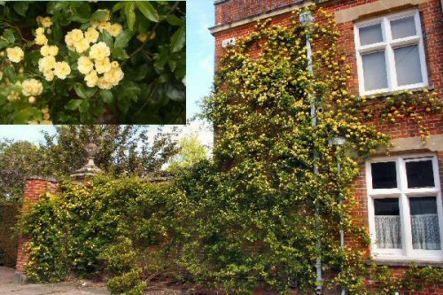 Hardy, climbing Rose, H and S 10m (30ft)  with dense clusters of scentless, rosette double pale yellow flowers 2cm (¾in) across borne on slender, thornless, light green stems in May. Native to central and western China.