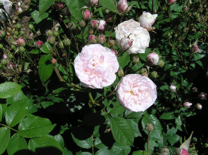 A vigorous medium-sized rose with arching stems bearing plentiful dark green foliage and large clusters of fragrant, double, light pink flowers 7cm in width, flushed with salmon pink in the centre