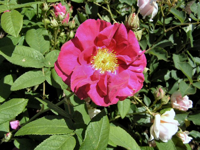 Gallica roses are compact, prickly shrubs with dull green foliage and generally fragrant, single to double flowers in small clusters in mid-summer. R. gallica var. officinalis is an erect, bushy small shrub with dull green foliage and semi-double, light crimson flowers to 8cm in width. Moderately fragrant
