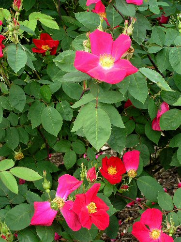 A large Rose to 3m, with reddish shoots bearing large dull green leaves and clusters of bright scarlet, single flowers 12cm in width, with prominent golden stamens, followed by large orange-red hips