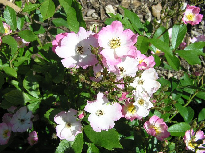 Flowering on this rose starts slightly later than some other varieties, but then continues well into autumn if plants are deadheaded. The individual single flowers are tiny, pale pink with a white eye, slightly fragrant, and gathered in large clusters. The plant has a dense, spreading habit with mid-green leaves
