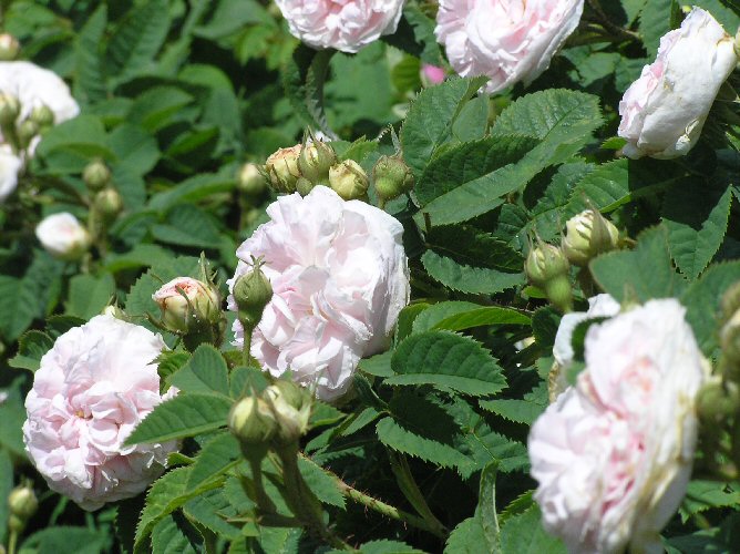 'Félicité Parmentier' is a compact small shrub of vigorous, upright habit,with good grey-green foliage and fragrant, flattish, very double flowers 6cm in width, of pale flesh-pink