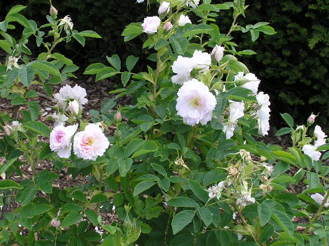 Grow in fertile, moist but well-drained soil that does not dry out, in full sun or partial shade. Unlike modern bush roses, shrub roses generally flower on older wood and should be allowed to develop naturally, with a light but regular pruning, during late winter, and with a balance of older wood and young, vigorous growth. Maintain a balanced framework by reducing strong new growth in late winter by up to one-third. Prune back the previous season's growths by a third to a half of their length and shorten strong sideshoots to two or three buds To encourage new shoots lightly pruning mature plants each winter by cutting some of the older main stems back to the base. This encourages vigorous new shoots from the base that will flower the following summer. Regularly dead head and mulch after pruning.
