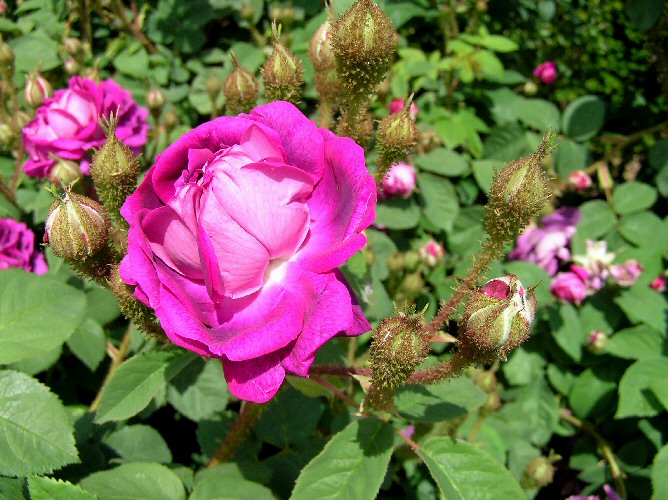 Grow in fertile, moist but well-drained soil that does not dry out, in full sun or partial shade. Unlike modern bush roses, shrub roses generally flower on older wood and should be allowed to develop naturally, with a light but regular pruning, during late winter, and with a balance of older wood and young, vigorous growth. Maintain a balanced framework by reducing strong new growth in late winter by up to one-third. Prune back the previous season's growths by a third to a half of their length and shorten strong sideshoots to two or three buds To encourage new shoots lightly pruning mature plants each winter by cutting some of the older main stems back to the base. This encourages vigorous new shoots from the base that will flower the following summer. Regularly dead head and mulch after pruning.