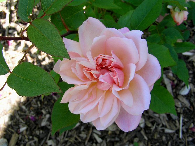 A small, repeat flowering bushy rose with large, quite shaggy flowers that are mostly pale pink, with a central pink-orange tone and good if weak fragrance.