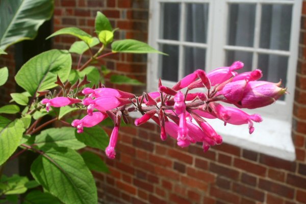 A tall, woody-based half-hardy perennial, native to Mexico, with heart-shaped, 10 cm long-stalked leaves and tubular, two-lipped, purplish-pink flowers with conspicuous pink bracts which soon fall.