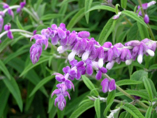 A downy, bushy, evergreen subshrub that has white flowers with conspicuous downy purple clayces from late summer to frost. It grows 1.2m with narrowly lance-shaped leaves white beneath and is great for the border.