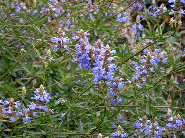 A hardy perennial native to southern Brazil, Uruguay, and Argentina growing up to 6 feet (1.8 m) tall in one season, with multiple thin stems and yellow-green lance-shaped leaves that have serrated edges. The plant quickly spreads on underground runners and is readily divided. The bright azure-blue flowers are .5 inches (1.3 cm) long with a white beeline in the throat pointing toward the nectar and pollen. They grow in whorls beginning in summer until autumn, with many flowers coming into bloom at the same time.