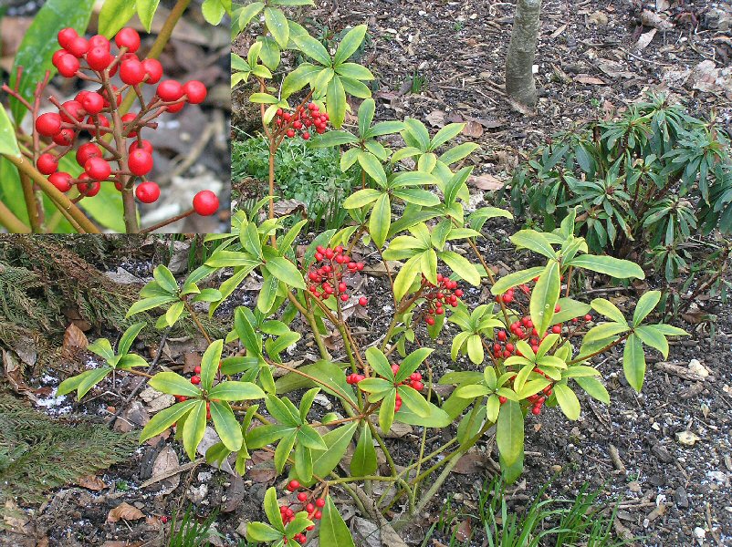 An erect, rounded, female, evergreen shrub with oval to lance-shaped, glossy, dark green leaves and dense panicles of fragrant, white flowers in spring, followed by large clusters of round, glossy, red fruit.