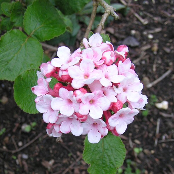 A hardy medium-large (2m x 2m) dense bushy deciduous shrub with ovate, irregularly toothed, dark-green leaves to 10cm (4in) long, often turning red in autumn. Exceptionally fragrant pink with red flowers 1cm (½in) across in domed, terminal corymbs to 8cm (3in) across followed by ellipsoid, red fruits 6mm (¼in) long, ripening to black.
