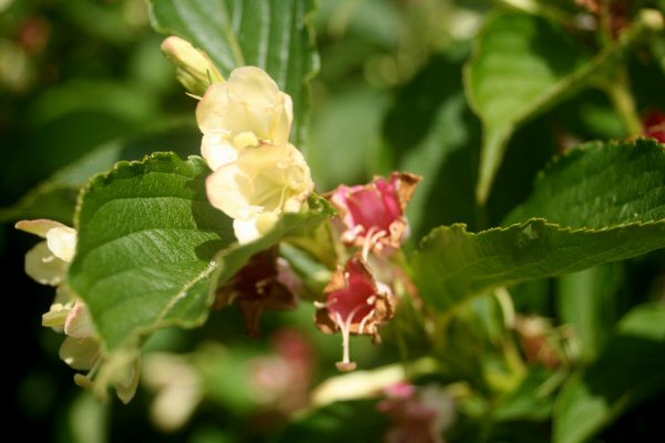 Rarely seen hardy deciduous flowering shrub, 4m (13ft) high by 3m (10ft) wide, with arching branches, grown for the masses of three coloured, funnel-shaped flowers in late spring amid bright green toothed leaves. The genus is native to East Asia and Japan.